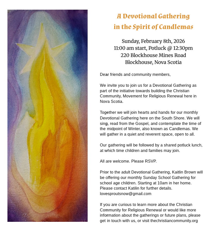 Together we will join hearts and hands for our monthly Devotional Gathering here on the South Shore. We will sing, read from the Gospel, and contemplate the time of the midpoint of Winter, also known as Candlemas. We will gather in a quiet and reverent space, open to all.